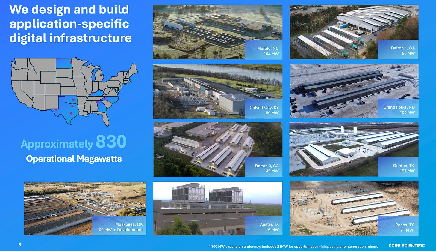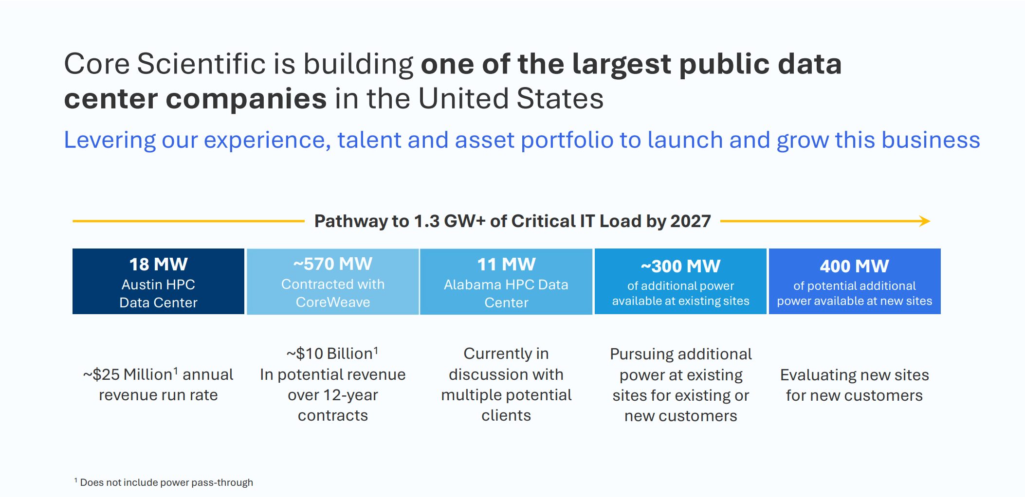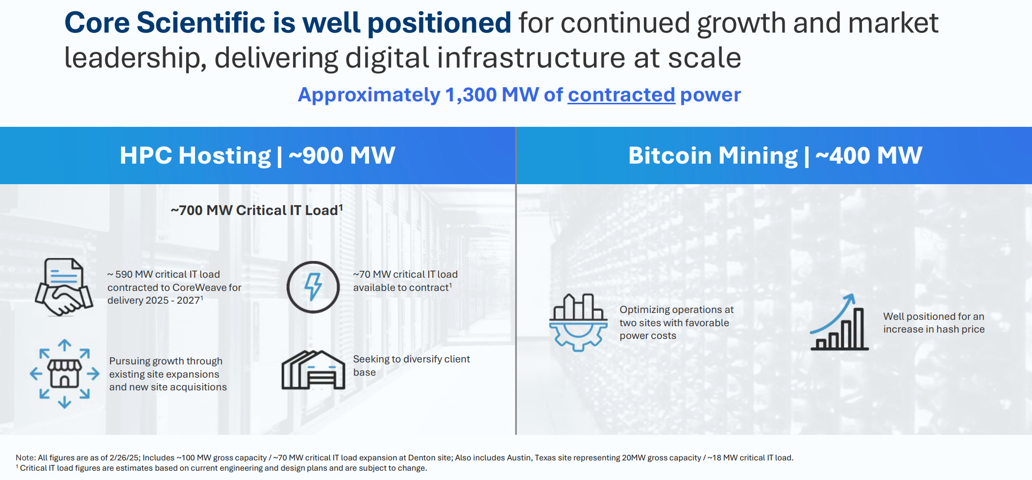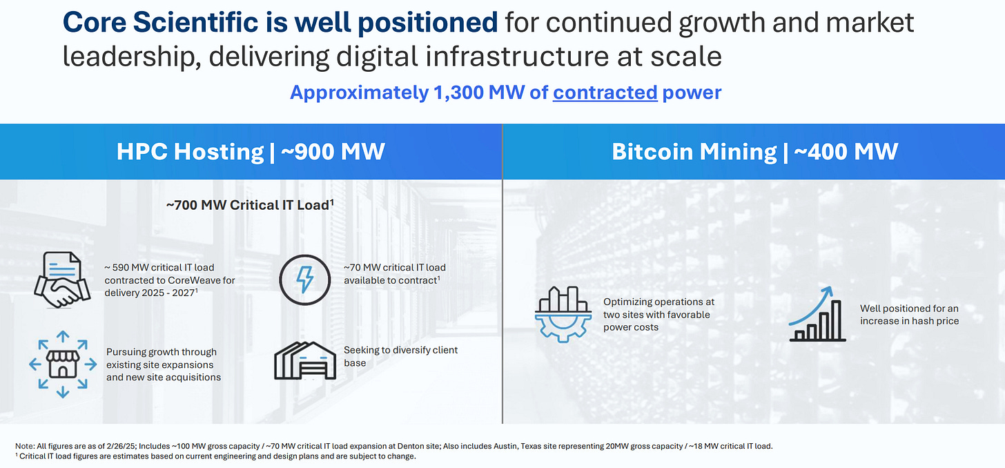Core Scientific runs large, purpose-built power sites (think: industrial-scale “vaults” for machines). They monetize those sites in three ways: they either use the power themselves to mine bitcoin, host someone else’s mining machines, or rent high-density data center capacity (HDC) to customers running AI/HPC workloads. So in a list: